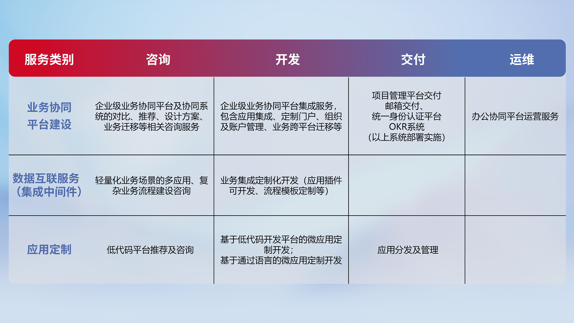 针对钉钉、、、企微、、、IDaas等平台级产品提供产品的规划、、方案、、、、交付、、、定制化开发等服务,,实现如统一协同办公、、智能客户服务、、、、混合会议管理、、、、智能数据查询、、、、等业务场景,,,,实现数字化转型。。。。